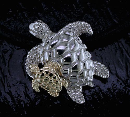 14K Gold and Sterling Silver Mother and Baby Turtle Pendnat