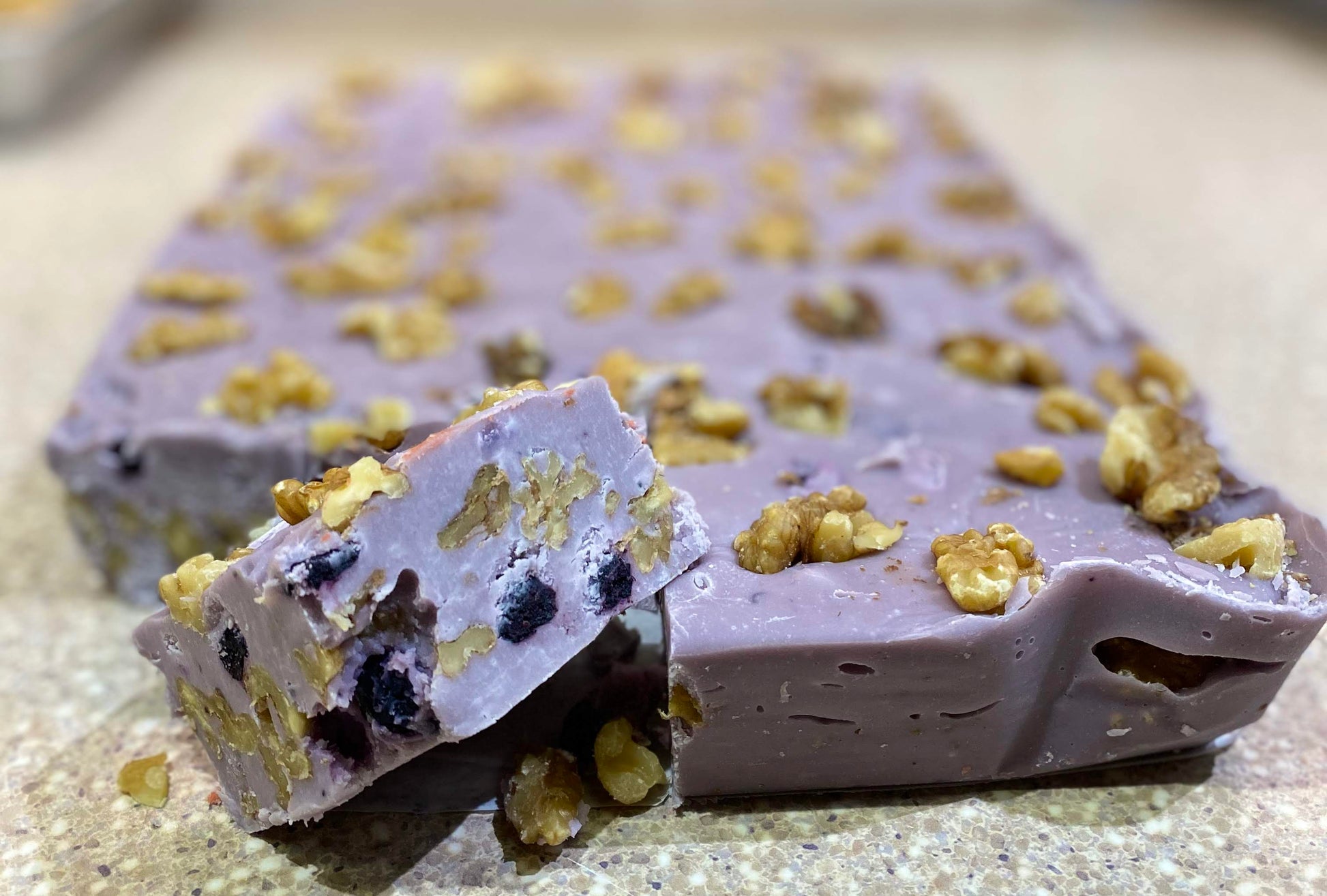 Rich and tangy Cheesecake fudge with real blueberries and fresh English walnuts.