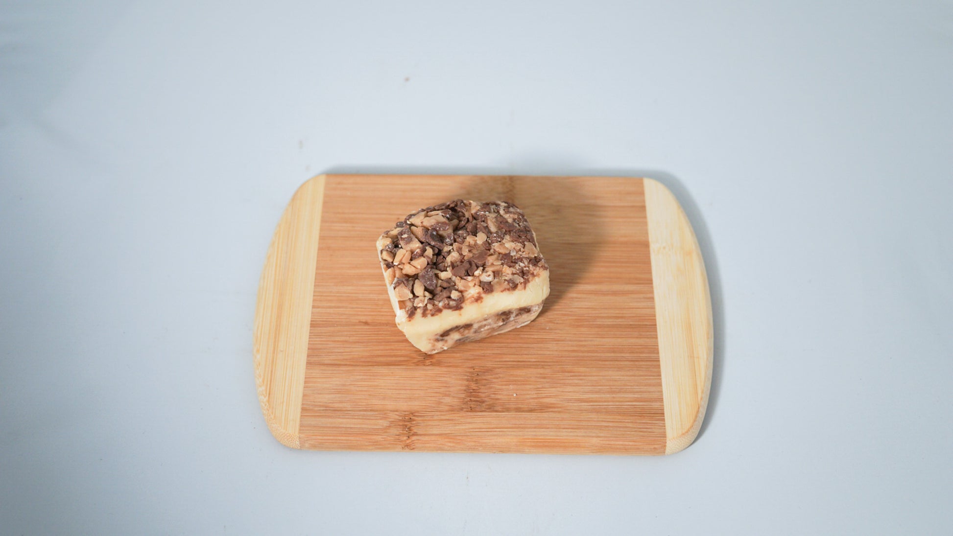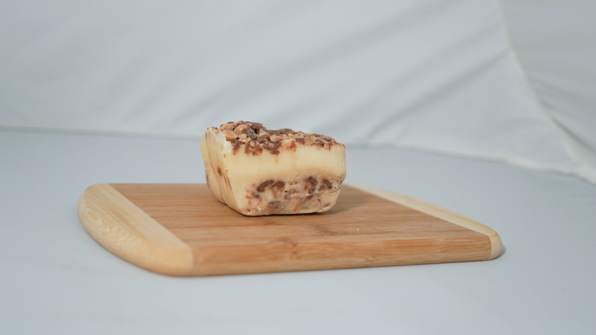 Our sweet and creamy vanilla fudge with a layer of crushed up Heath English Toffee inside and on top with some chunks hidden on the inside,