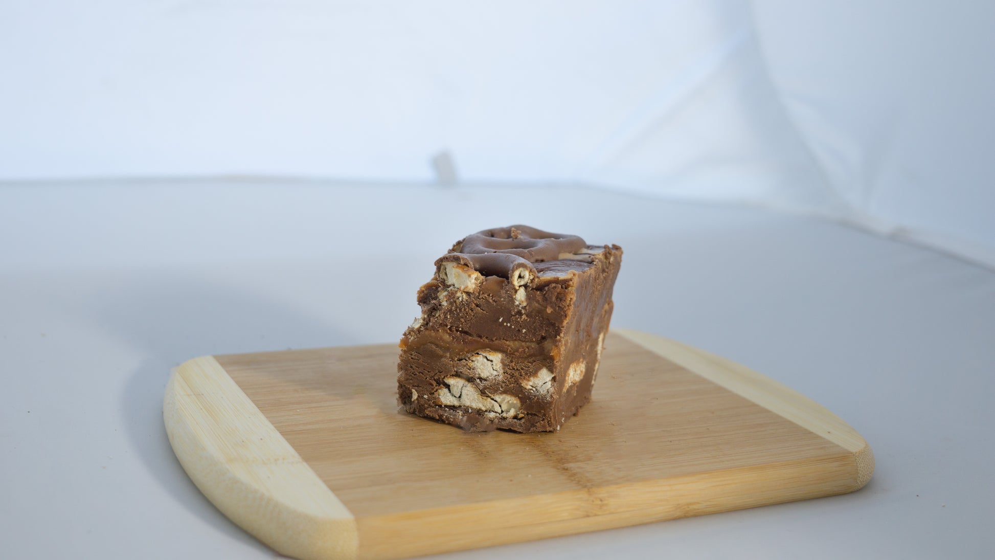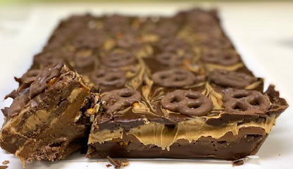 This is a winning creation by a customer. AWF Chocolate fudge with, Jiff Peanut Butter, creamy caramel, and chocolate covered pretzels.