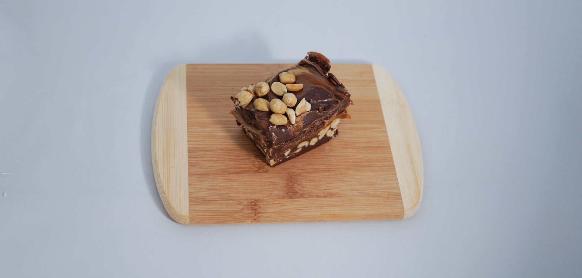 Snickeroo is a chocolate based fudge with peanut butter, caramel, and peanuts!